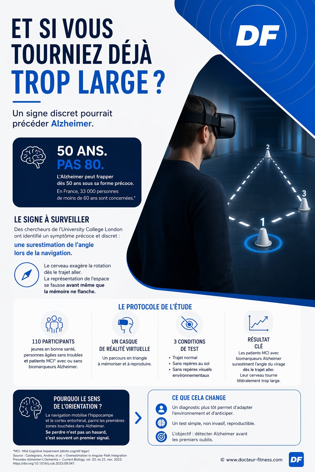 Le test : un casque de réalité virtuelle. Un parcours balisé par des cônes numérotés, formant un triangle. Les participants devaient mémoriser le trajet, puis retrouver leur point de départ. Trois variantes étaient proposées : le chemin normal, une version sans repères visuels au sol, et une version où tous les points de repère environnementaux avaient été effacés.
