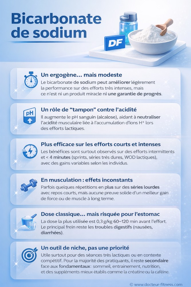 Pour ce type de profil, une stratégie classique est d’envisager 0,3 g/kg environ 60 à 120 minutes avant la séance, en sachant que le gain restera modeste, que tout le monde ne répond pas pareil… et qu’il faut accepter un risque réel de soucis digestifs. Pour la plupart des pratiquants de musculation qui récupèrent correctement, prennent des temps de repos “normaux” et ne sont pas en compétition, le bicarbonate reste un outil de niche, loin derrière des fondamentaux comme le sommeil, le programme, la nutrition et, en supplémentation, des valeurs sûres comme la créatine ou la caféine.