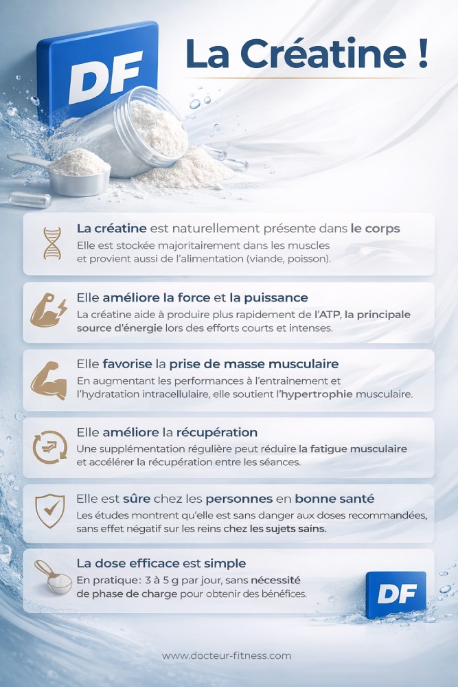 - La créatine améliore les performances physiques pour les exercices de haute intensité, principalement en saturant les muscles en créatine et en phosphocréatine, ce qui permet un recyclage rapide de l’ATP pendant un effort.
