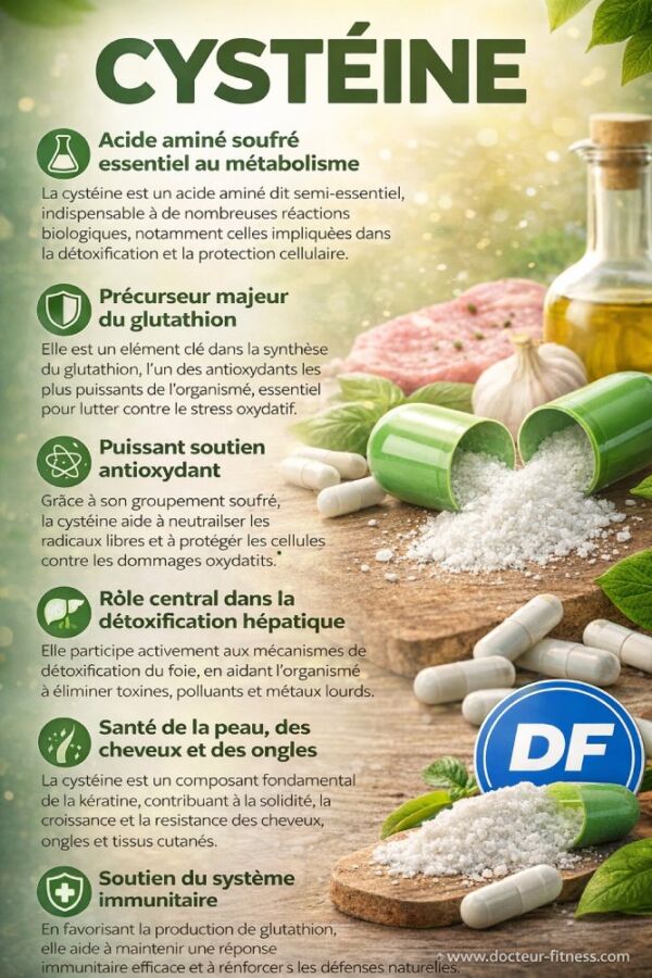 La cystéine, nécessaire à la synthèse du glutathion, possède donc ce double rôle d’antioxydant majeur ainsi qu’un rôle de détoxication hépatique.