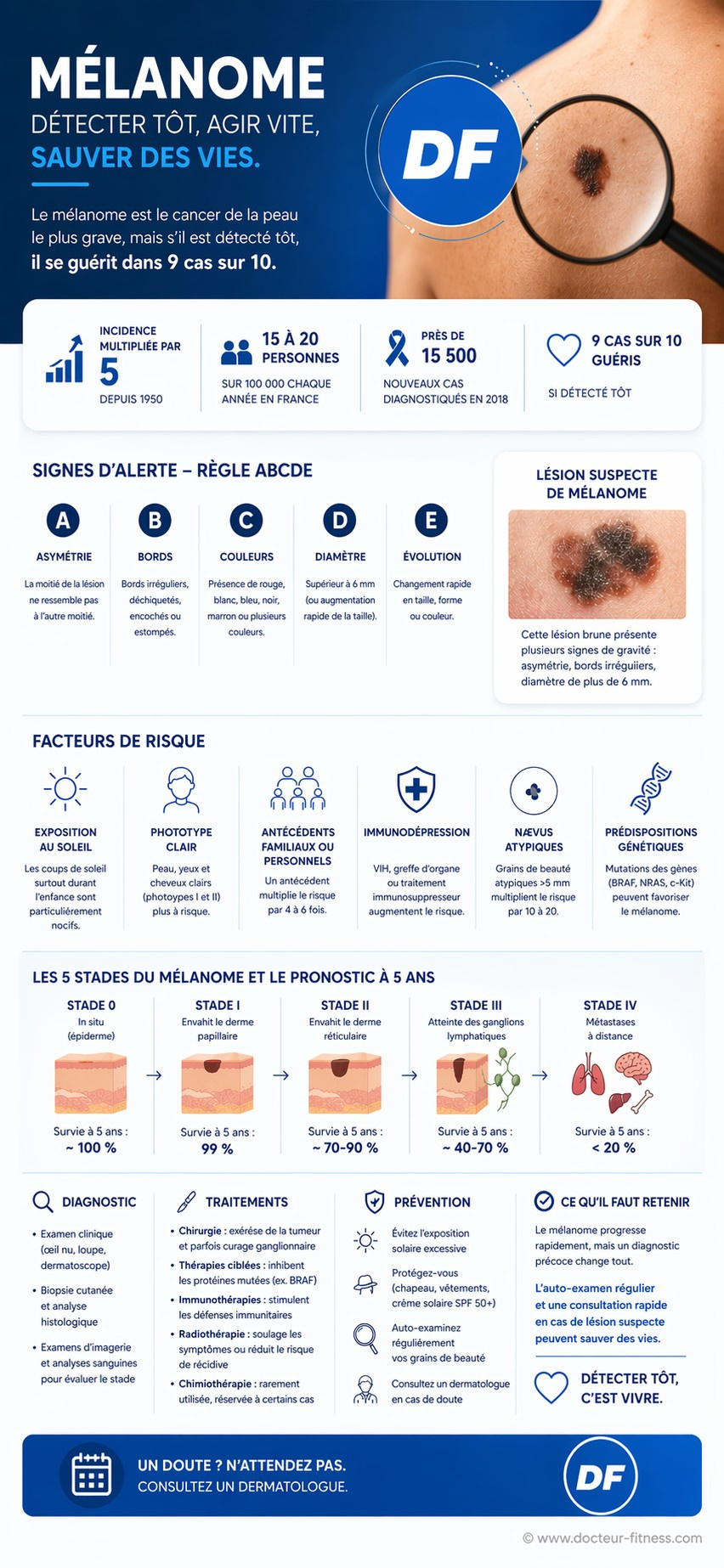 Plus le mélanome est diagnostiqué tôt, meilleur est le pronostic : le taux de survie à 5 ans est de 99 % au stade I, mais chute à moins de 20 % au stade IV métastatique.