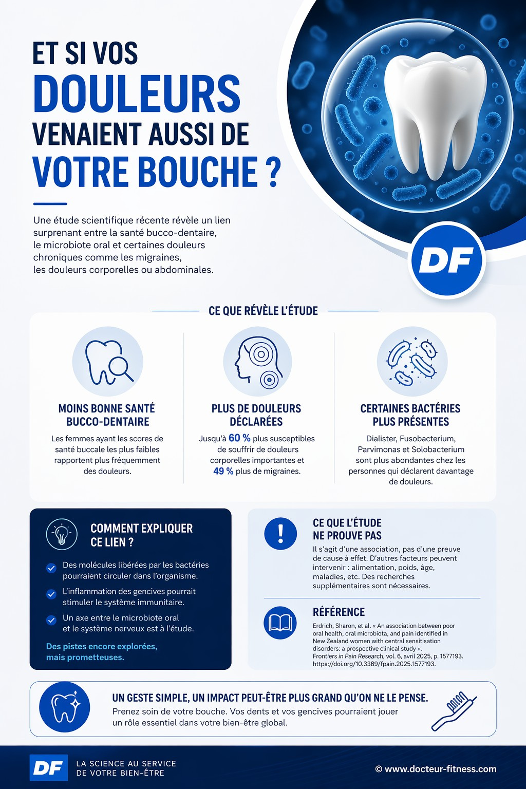 Une étude scientifique récente publiée dans la revue Frontiers in Pain Research(1) s’est penchée sur une question simple : la santé des dents et des gencives pourrait-elle être liée à certaines douleurs dans le corps ? Les résultats intriguent. Mais pour comprendre pourquoi, il faut d’abord regarder ce qui vit dans la bouche.