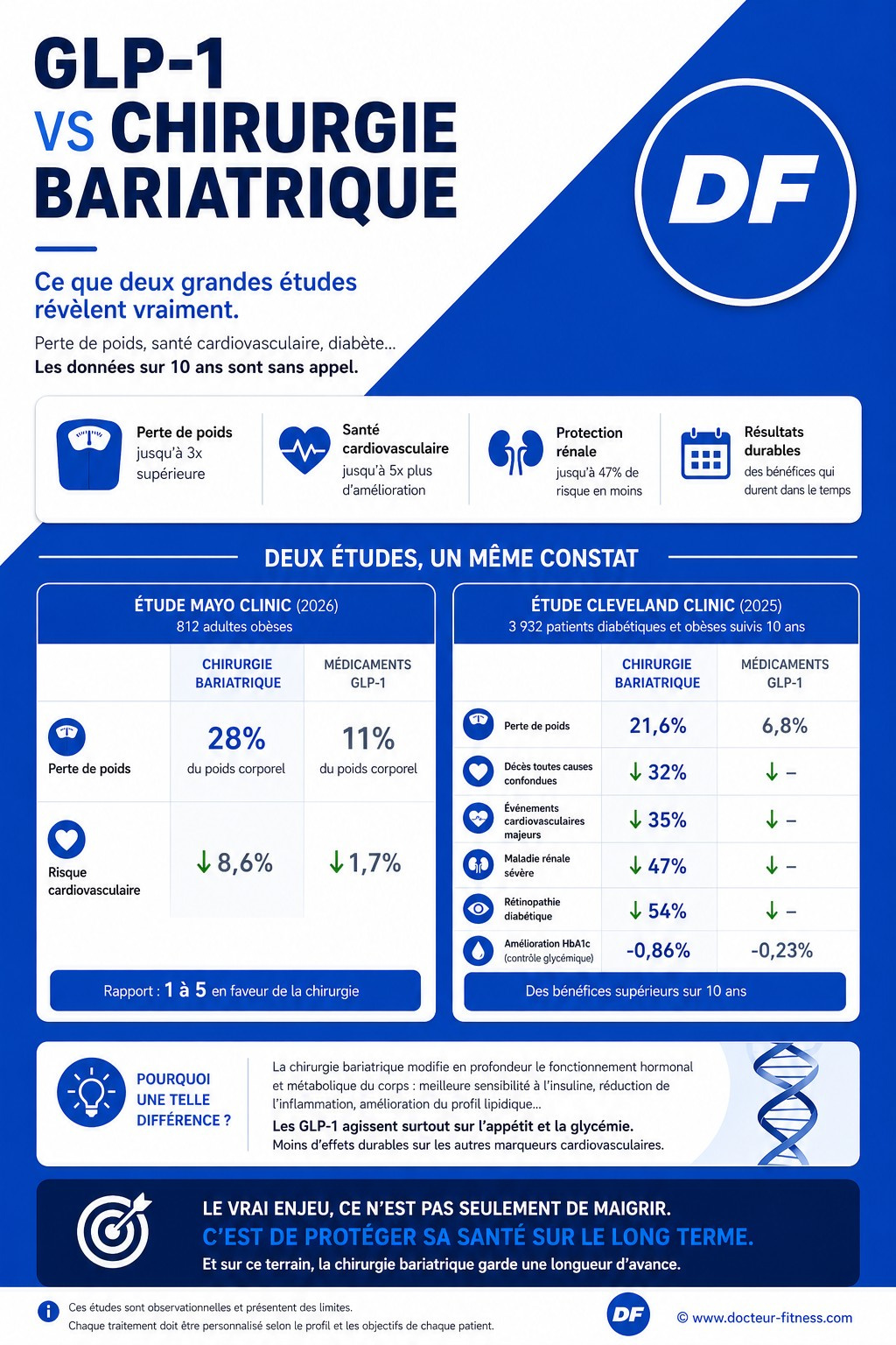 Quelques mois plus tôt, une autre équipe (Cleveland Clinic) avait suivi 3 932 patients diabétiques et obèses pendant 10 ans. Les résultats, publiés dans Nature Medicine, sont encore plus parlants, car le suivi est beaucoup plus long.