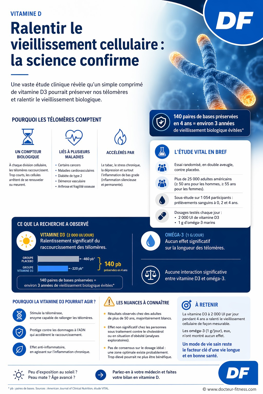 La vitamine D3 à 2 000 UI par jour, prise pendant quatre ans, a ralenti de manière significative le raccourcissement des télomères chez des adultes de plus de 50 ans, soit l’équivalent d’environ trois années de vieillissement biologique évitées. Les oméga-3 marins, à la dose testée, n’ont montré aucun effet. Il s’agit du premier essai randomisé de grande ampleur à confirmer ce bénéfice, ce qui renforce l’hypothèse d’un rôle protecteur de cette vitamine dans le vieillissement cellulaire.